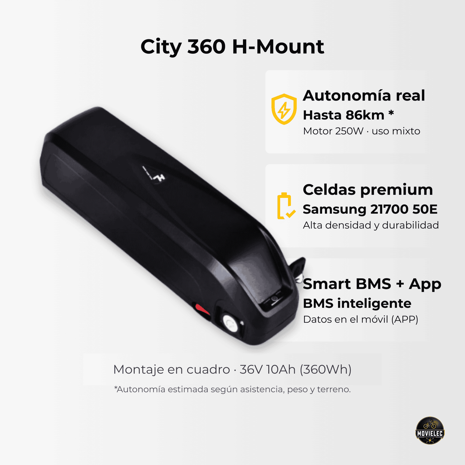 La Movielec City 36V H-Mount es una batería pensada para quienes buscan más autonomía sin renunciar a un formato equilibrado para uso diario. Combina celdas premium y un sistema de gestión inteligente para una entrega de energía estable y un control cómodo desde el smartphone.